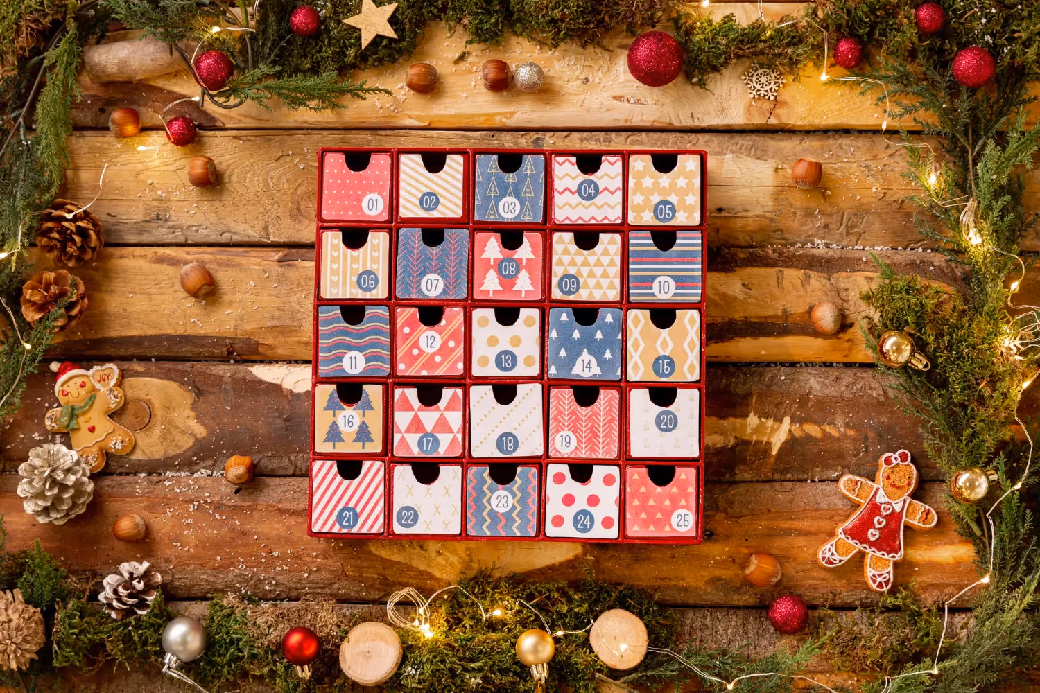 A special calendar counting down the days until Christmas, often with small gifts or chocolates behind each door.